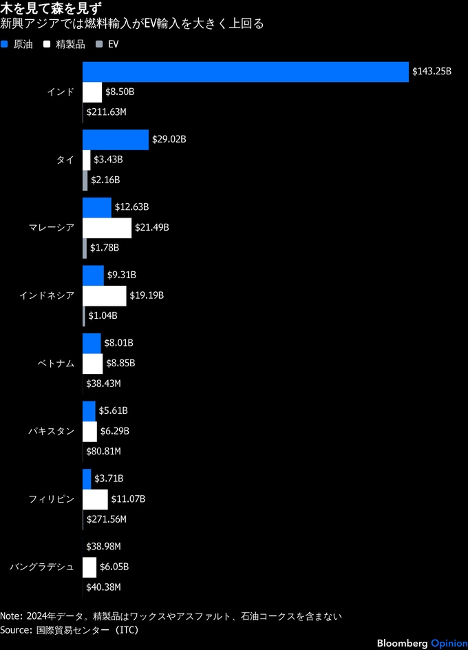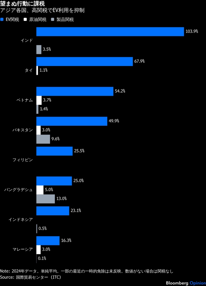 輸入燃料の支出はEVへの支出を大きく上回る。しかも、ガソリンは毎年支払いが必要な継続コストだが、自動車は一度きりの購入だ。それにもかかわらず、アジア各国はEVに最大105%もの関税を課す一方、原油はほぼ無税で輸入している。