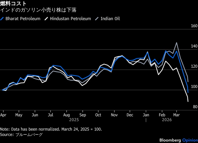 インドの国営ガソリン販売大手3社の株価も3月、大きく下落。原油価格上昇時にガソリンやディーゼル油で損失を被ると見込まれているためだ。