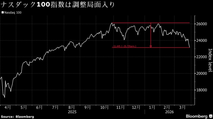 イランでの戦争は5週目に入り、市場の主な関心事は依然としてエネルギーコストの上昇と、それが経済成長を抑制し中央銀行による利上げを招くリスクに集まっている。投資家が人工知能(AI)ブームへの潜在的な悪影響を注視する中、ハイテク株比率の高いナスダック100指数は27日に調整局面入りした。