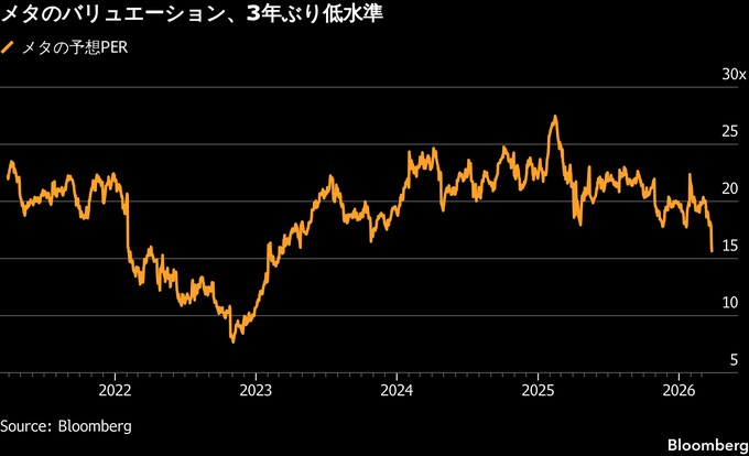 収益予想の上方修正と株価下落が重なり、メタは「マグニフィセント・セブン」の中で最も割安な銘柄となっている。今後12カ月の予想利益に対する株価収益率(PER)は約16倍と、2023年3月以来の低水準だ。