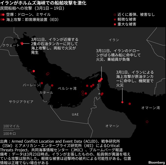 ブルームバーグがまとめたデータによると、3月に入ってからホルムズ海峡を通過した110隻のうち、36%強は制裁対象のイラン船、あるいはイランのために運航するいわゆる「影の船団」だった。石油タンカーに限って言えば、通過した35隻のうち21隻がイランと直接的な関係を持ち、残り大部分もイランと友好関係を持つ国が最終目的地だった。