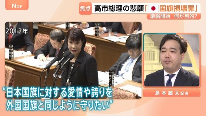「国旗損壊罪の創設はもともと高市総理が取り組んできたテーマの1つです。過去には“日本国旗に対する愛情や誇りを外国の国旗と同じように守りたい”と主張していて、刑法の改正案を国会に提出したこともあります。それが今月おこなわれた維新との党首会談で、今の国会での成立を目指すことになり、議論が再スタートしました」