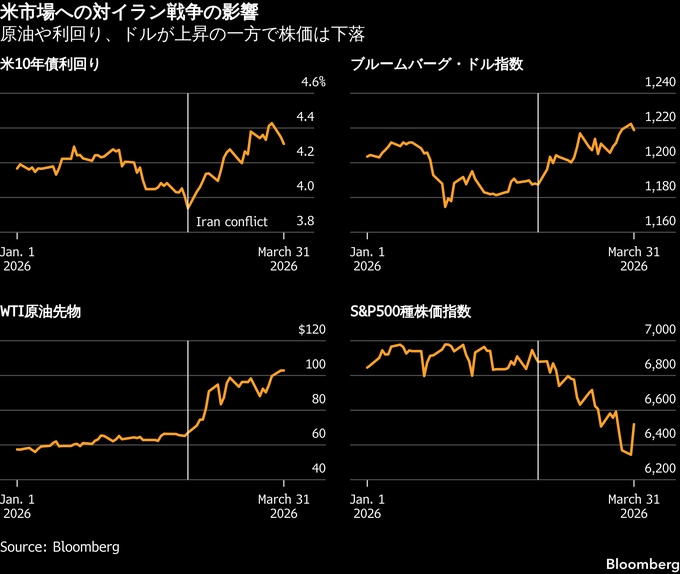 米国債相場は3月31日の取引で上昇したものの、10年債利回りは月間で35ベーシスポイント(bp、1bp=0.01%)上昇。エネルギーコスト上昇によるインフレ高進リスクや、米連邦準備制度が来年にかけて利下げする可能性の後退を反映している。