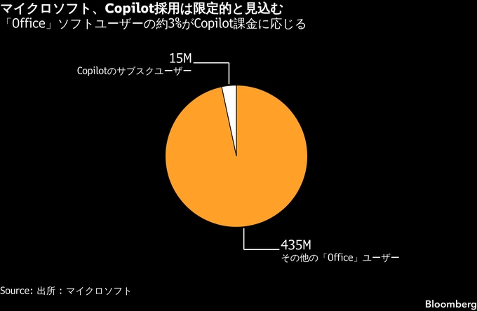 同社は1月、職場向け主力AIツールであるCopilotについて、有料で利用している顧客は全体の約3%にとどまると明らかにしていた。この発表は、より多くの顧客が対価を支払うと期待していた一部投資家の失望を招いた。
