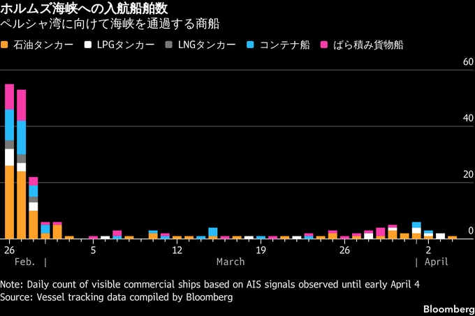 それでも通航量は、戦争前の水準のごく一部にとどまる。戦争前は世界の石油および液化天然ガス(LNG)の約5分の1がこの海峡を通過していた。