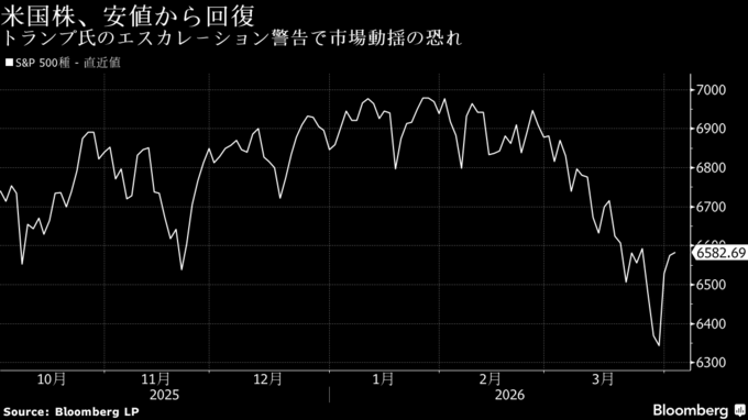 (ブルームバーグ):イランとの戦争を大幅にエスカレートさせる可能性があるというトランプ米大統領の警告が、週明け前の段階で株式・債券・原油市場に影を落としている。既に世界経済の見通しを揺るがしているエネルギー価格ショックは、こうした事態となれば、さらに悪化する恐れがある。