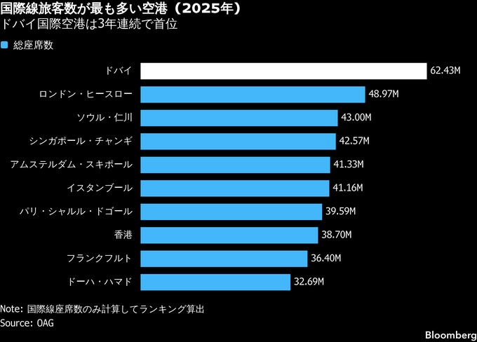 これによりドバイは世界で最も利用者の多い国際空港となり、その地位を過去3年間維持している。一方でライバル各社は中東勢について、不公正な補助金によって支えられてきたと主張している。
