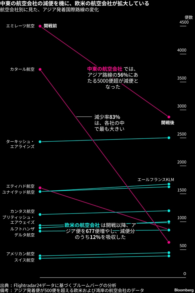 ブルームバーグはフライト追跡会社フライトレーダー24のデータを用い、戦争開始前後1カ月の主要航空会社21社におけるワイドボディー機の運航を分析した。