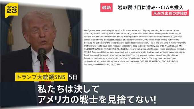 アメリカとイラン双方が乗員を懸命に探す中、トランプ氏は5日、SNSで「救出したぞ!」と投稿。イラン国内で乗員を救出したと明らかにしました。
