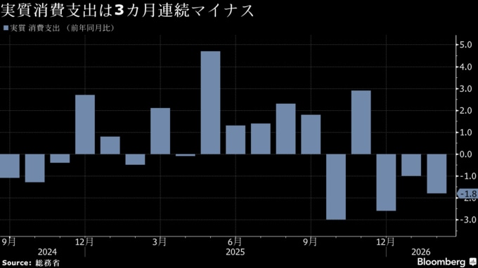 (ブルームバーグ):2月の消費支出は物価変動の影響を除いた実質ベースで3カ月連続のマイナスとなった。減少幅は市場予想を上回った。教育費や自動車関係費などが減少した。