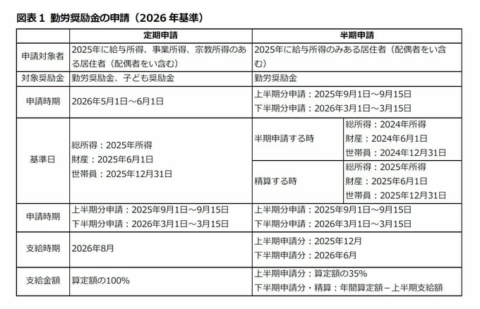 勤労奨励金の申請については、給与所得のみの者は、半期ごとの申請と年1回の申請のいずれかを選択して申請することができるが、事業所得または宗教所得のある者は、年1回の申請のみ利用できる。