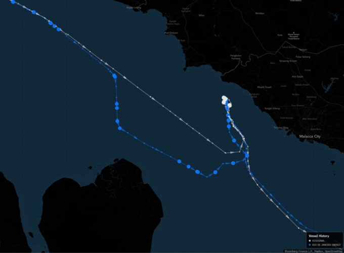 ブルームバーグがまとめた船舶追跡データによると、超大型原油タンカー(VLCC)「KISOGAWA」は5日、マレーシア西岸のリンギ沖でVLCC「RIO DE JANEIRO ENERGY」から中東アブダビ産の原油約120万バレルを受け取った。約1週間前にも、アブダビ産原油が洋上で積み替えられ、現在日本に向かっている。