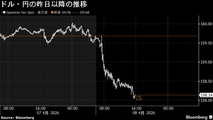 円は対ドルで158円台前半へ急伸。米・イランの期限付き停戦合意を材料に円買い・ドル売りの動きが優勢だった。セントラル短資FX市場業務部の富永貴之部長は「2週間延長は一つの落としどころ」だとし、有事のドル買いの流れが巻き戻されたとみる。