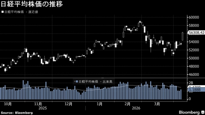 (ブルームバーグ):8日の日本市場は株式が5%を超す上昇率となり、日経平均株価は1カ月ぶりの高値を付けた。米国とイランの2週間の停戦合意を受け海外原油市況が急落し、日本経済の足かせとなっていたインフレと原油輸送を巡る懸念が和らいだ。円も急伸し、債券も上昇(金利は低下)するトリプル高。