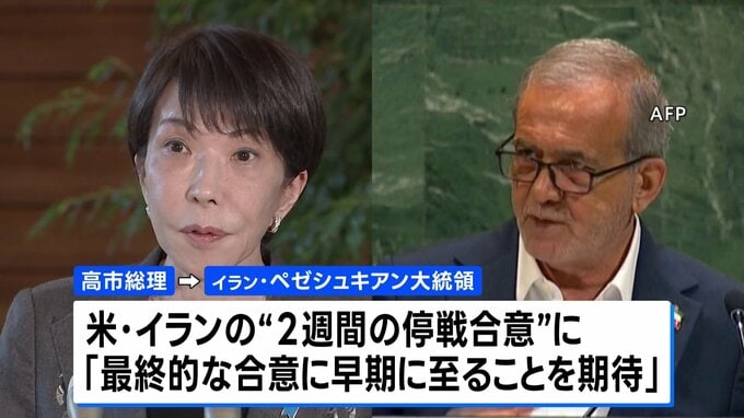 高市総理はイランのペゼシュキアン大統領と電話会談し、アメリカとイランの“2週間の停戦合意”について、「最終的な合意に早期に至ることを期待している」と伝えました。高市総理「日本とイランの首脳電話会談に…