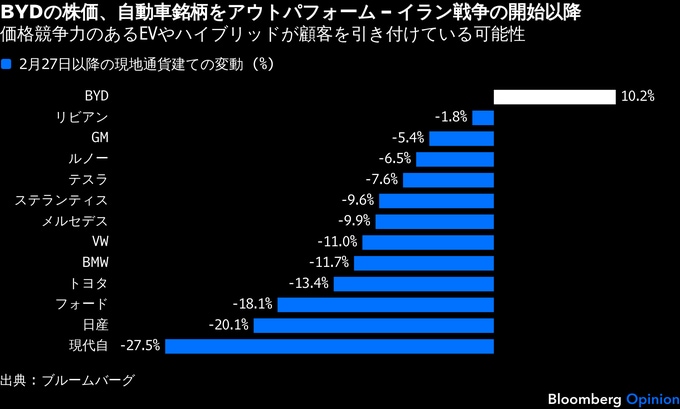 (ブルームバーグ):欧米の自動車メーカーは、温室効果ガス排出規制の緩和や需要減少を受け、電気自動車(EV)の目標を下方修正してきた。購入者は次に買う車が果たしてEVになるのかどうか、確信を持てずにいた。だが、こうした前提は予期せぬ変化によって揺らいでいる。イラン戦争をきっかけとしたガソリン価格の高騰だ。