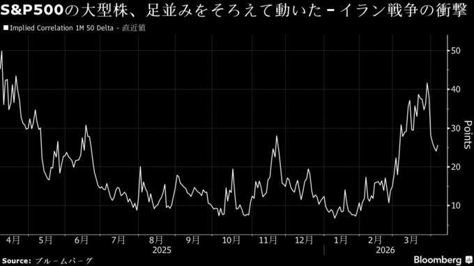 今回の損失で、大規模な地政学イベントに対するこの戦略の脆弱(ぜいじゃく)性が露呈した。イラン情勢の緊迫化に伴い、投資家は指数レベルでのヘッジを急ぎ、S&P500種株価指数のインプライドボラティリティー(IV、予想変動率)を急上昇させた。一方で個別株の値動きは連動性を強め、ディスパージョントレードが収益源とする個別銘柄と指数のボラティリティー差が縮小した。