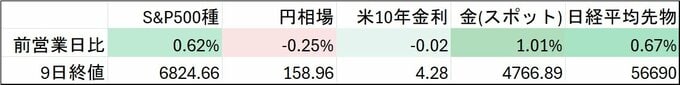 (注:表中の終値は米国時間終値。円相場は対米ドル、前営業日比は円の対ドル変化率。米10年金利の前営業日比は変化幅(単位:%ポイント)。日経平均の前営業日比はシカゴ・マーカンタイル取引所清算値と大阪取引所清算値との比較。シカゴ取引所が休場の場合は大阪取引所の前日清算値と最終取引値の比較。金は1トロイオンス当たりのドル建て価格)