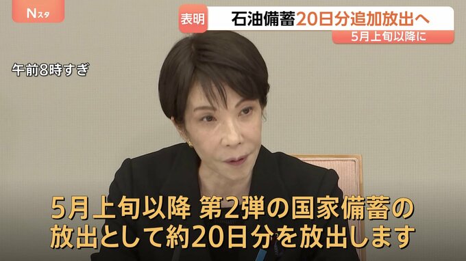 高市総理はきょう、中東情勢の緊迫化が続く中、原油を安定的に供給するため、石油の国家備蓄を来月上旬以降、およそ20日分、追加で放出すると表明しました。高市総理「原油の安定供給に万全を期すため、5月上旬以…