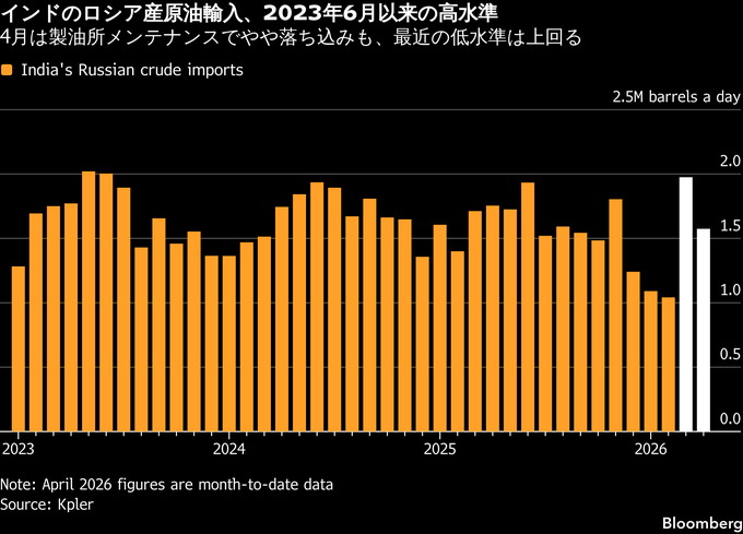海上輸送データ分析のケプラーによると、インドが輸入するロシア産原油は3月に日量平均198万バレルと、2023年6月以来の高水準に上った。4月は同157万バレルと低下しているが、主にロシア産原油を日量40万バレル処理する能力を持つナヤラ・エナジーの製油所がメンテナンスのため操業を停止したことが大きな理由だ。