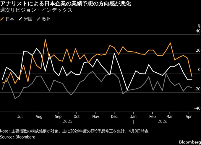ブルームバーグの集計によると、アナリストの業績予想の方向感を示すリビジョン・インデックス(RI)は4月第2週に急低下し、昨年7月以来のマイナスに転じた。予想の下方修正の数が上方修正を上回っていることを示し、低下幅は欧米株より大きい。
