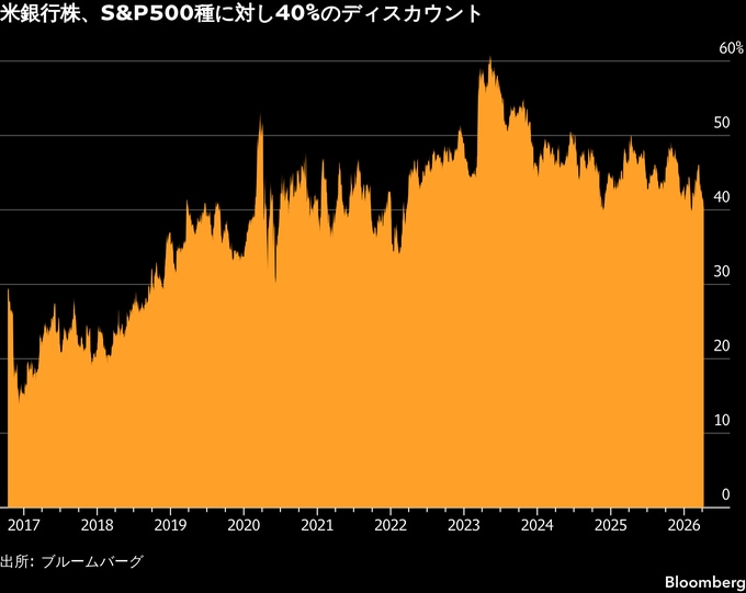米銀行株は10日に一時1.1%下落したものの、ここにきて持ち直しており、4月初めから約7%上昇。それでも予想株価収益率(PER)は12倍にとどまり、S&P500種の20倍に対して40%のディスカウントで取引されている。
