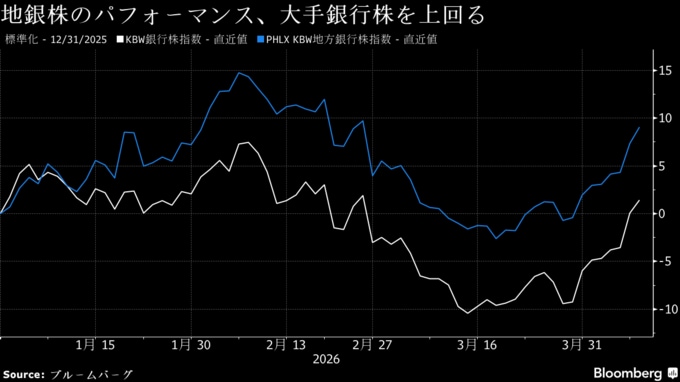 KBW銀行株指数は1-3月に6%下落。地方銀行の混乱で株式相場が動揺した23年以来の低調な四半期となった。25年には29%上昇し、S&P500種株価指数やナスダック100指数を上回るパフォーマンスとなっていた。