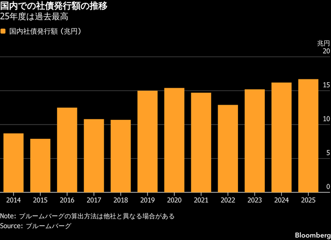 (ブルームバーグ):日本企業の社債発行額が2026年度に過去最高を更新する見通しだ。約30年に及んだデフレからの脱却が進み、合併・買収(M&A)を背景とした企業の資金需要が拡大している。