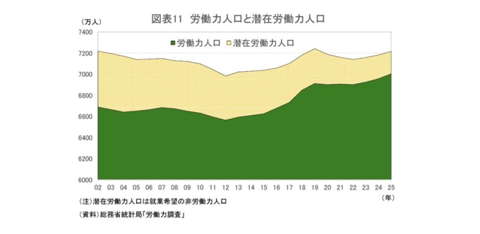 労働力人口は2002年の6689万人から2025年には7004万人(+315 万人)へ増加した。一方、潜在労働力人口は、2002年の529 万人から2025 年には212万人(▲317 万人)まで減少した。