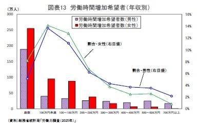 就業者全体では労働時間減少希望者が1173万人と、増加希望者(445万人)を大きく上回る(2025年の数値)が、短時間就業者(週労働時間34時間以下)に限れば、増加希望者が291万人と減少希望者の234万人を上回る。