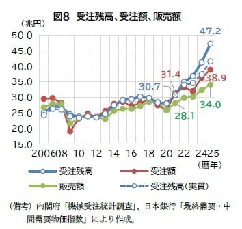 また、近年の物価上昇により、受注単価自体が上昇している影響もあるが、日本銀行の「最終需要・中間需要物価指数」における資本財(国内品)をデフレーターとして受注残高を実質化してみても、やはりその伸びは急速である。