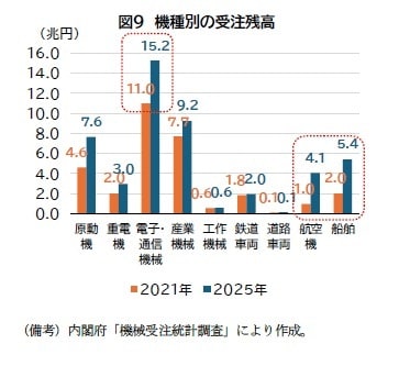 この点、受注残高と販売額については、需要者別には調査されていないため、官公需の影響は直接には分からないものの、受注残高を機種別に見ると、2021年から2025年にかけて受注残高が大きく増加した上位3位は、電子・通信機械(+4.3兆円)、船舶(+3.4兆円)、航空機(+3.1兆円)となっている。