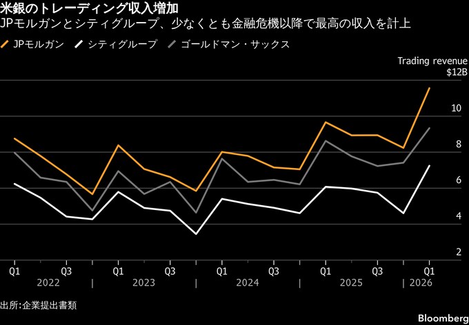 (ブルームバーグ):ウォール街の米金融機関のトレーディング部門は1-3月(第1四半期)に、世界市場を揺るがした地政学的混乱の中で顧客取引が活発化し、収益が過去最高を記録した。一方で投資家は、市場のボラティリティーが他の事業分野を揺るがす恐れがあるとして懸念を強めている。