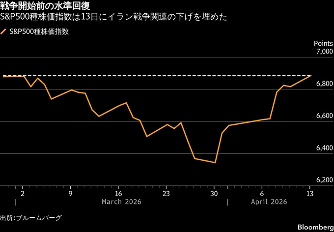 13日の取引は、戦争を巡る不安が和らいでいることを示した。米国とイランが週末の和平交渉で打開策を見いだせなかったことを受け、取引開始時点でS&P500は横ばいで推移したが、取引終了時には1%上昇した。結果として、同指数は戦争による下げを埋めた。14日も1.2%上昇した。