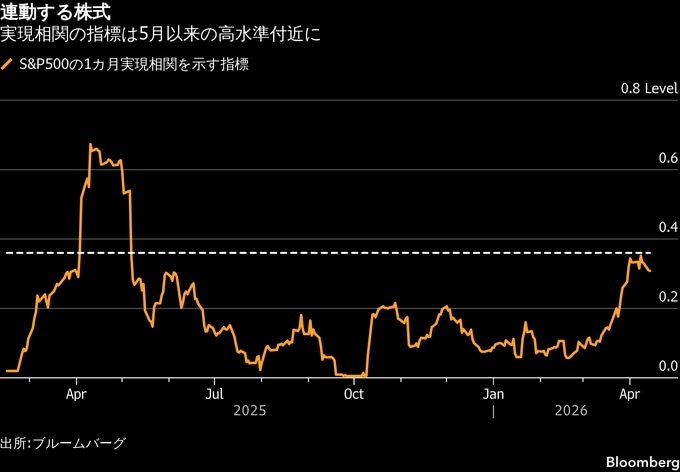 一方、急速な反発や機関投資家による指数連動型商品の活用で高まっていた株式間の相関は、今後落ち着く見通しだ。指数構成銘柄の1カ月実現相関を示す指標は昨年5月以来の高水準付近で推移しており、企業固有の要因よりもマクロ経済のニュースで株価が動く傾向が強まっていたことを示唆している。