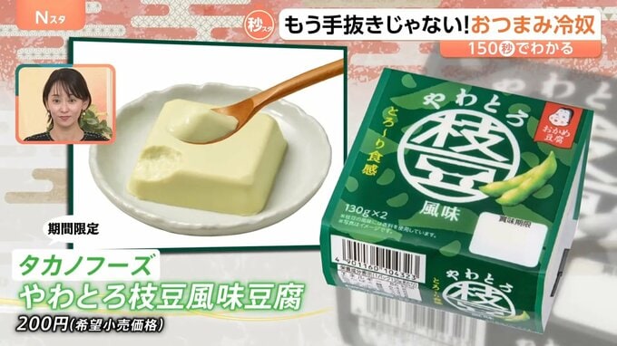 さらに、タカノフーズの枝豆の風味をいかした豆腐「やわとろ枝豆風味豆腐」(200円 ※希望小売価格)も人気。お酒好きにはたまりません。