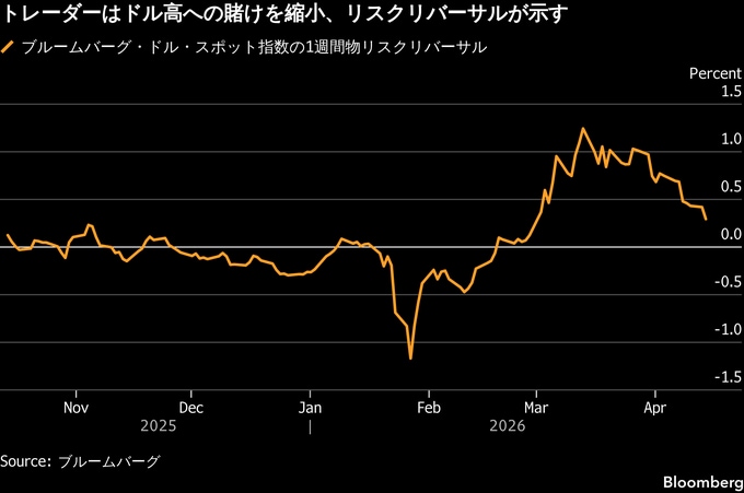 オプション市場では、ブルームバーグ・ドル・スポット指数のいわゆるリスクリバーサルで、ドル高に備えるヘッジとドル安に賭ける取引とのプレミアム格差が今月に入り縮小している。