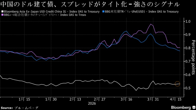 ブルームバーグの指数によると、中国の投資適格ドル建て債の平均スプレッドは約53ベーシスポイント(bp、1bp=0.01%)で、米国の高格付け社債より約26bp小さい。これは過去10年と逆で、以前は中国債の方が米社債より大きなスプレッドだった。
