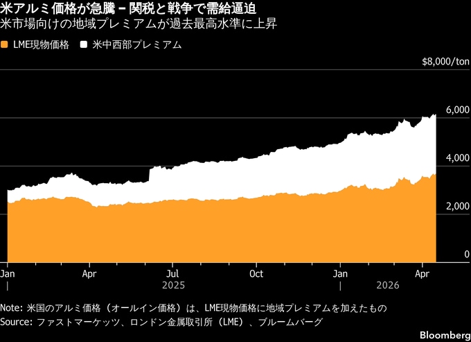 イラン戦争以前から、トランプ政権の輸入関税によりカナダからの流入が抑制され、米国のアルミ価格は上昇していた。世界指標に上乗せされる米中西部プレミアムは今年、過去最高を更新し続けている。