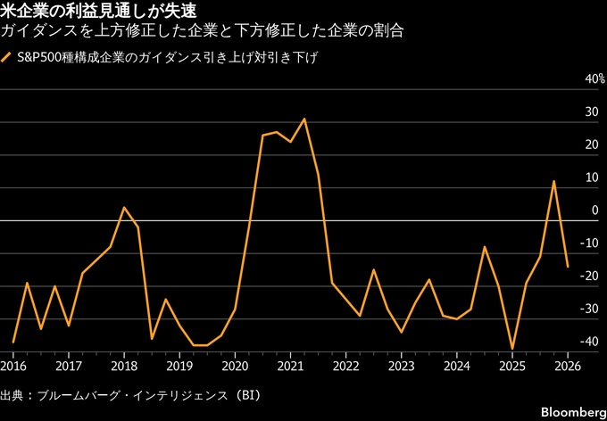 ブルームバーグ・インテリジェンス(BI)の集計によると、S&P500種株価指数の構成企業のうち、四半期見通しを引き下げた企業はすでに40社に上り、関税導入が始まった2025年4-6月期(第2四半期)以来の高水準となっている。BIはガイダンスの勢いについて、25年10-12月期(第4四半期)よりも「弱い」と指摘した。