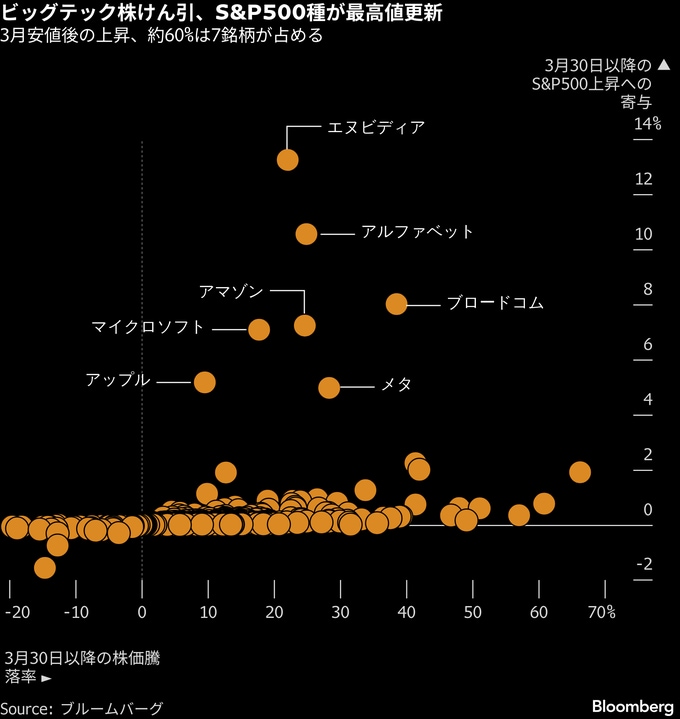 S&P500種の最近の上昇の半分超は、わずか7社によるものだ。エヌビディアとアマゾン・ドット・コム、マイクロソフト、ブロードコム、アルファベット、メタ・プラットフォームズ、アップルの7社で、ブルームバーグがまとめたデータによると、これら企業の時価総額は数週間で合計約4兆ドル拡大した。