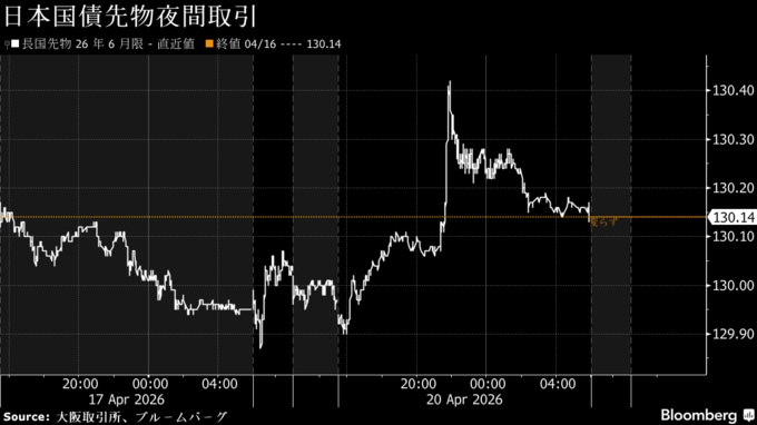 先物の夜間取引で中心限月6月物は17日の日中取引終値比17銭高の130円14銭で終えた。鶴田氏の先物の予想レンジは129円90銭-130円20銭、新発10年債利回りは2.4-2.43%(17日は2.42%で終了)。17日の米10年国債利回りは前日比6ベーシスポイント(bp、1bp=0.01%)低い4.25%程度で引けた。