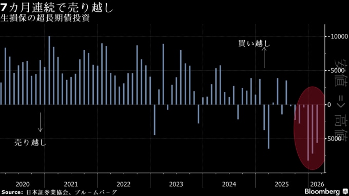 日本証券業協会のデータによると、生保と損害保険会社を含む保険会社は主な投資対象である超長期債を2月まで7カ月連続で売り越した。
