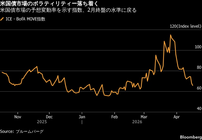 イランでの戦争初期に、原油価格の急騰を受けて大幅上昇した米国債利回りは過去数週間、一定のレンジ内で落ち着いて推移。ボラティリティーも低下し、債券市場の変動性を示す指標の一つは、おおむね戦争前の水準近くまで戻った。