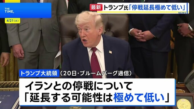 アメリカのトランプ大統領はイランとの停戦期限について、「延長する可能性は極めて低い」と主張しました。ブルームバーグ通信によりますと、トランプ大統領は20日、イランとの停戦について「延長する可能性は極め…