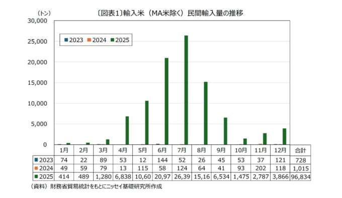 民間輸入米が増加した主因は、国産米の供給不足にある。天候要因や作柄の変動、在庫水準の低下などが重なり、国内の米需給は一時的に引き締まった状態となった [小前田大介, 2025]。