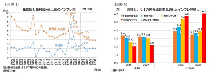 また、インフレ見通しは26年5.4%、27年3.9%とされた。「深刻シナリオ」では悪影響が27年まで継続し、世界成長率見通しは26年2.0%、27年2.2%、インフレ見通しは26年5.8%、27年6.1%とされている。