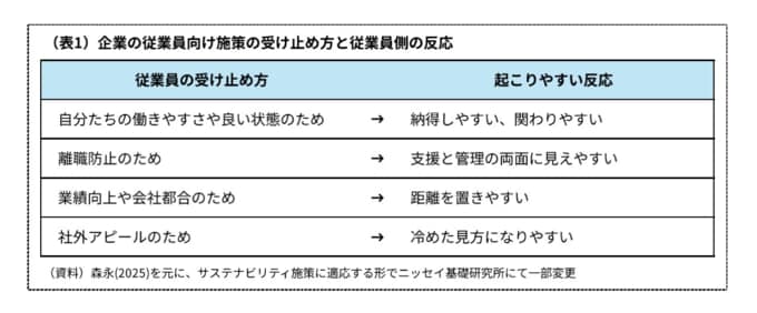 これはサステナビリティ関連の社内施策に限った話ではないが、HR(人事)関連施策の実効性を考えるうえでも、従業員がその施策をどのように受け止めるかは重要な論点とされている。
