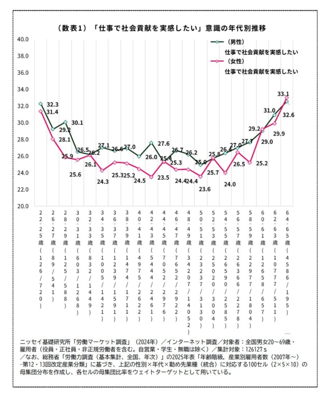その点で示唆に富むのが、次の「仕事を通じた社会貢献意識に関する調査」データである。ニッセイ基礎研究所の調査によれば、「仕事で社会貢献を実感したい」という意識は、20代で相対的に高めにみられている。30代から50代前半でいったん低下し、60代で再び上昇する流れとなっている。