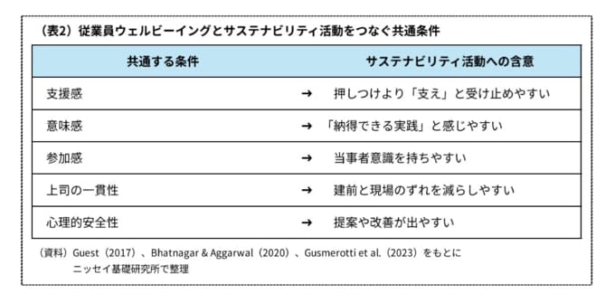 こうした条件が従業員の就労環境として整っている時、サステナビリティ活動は「会社から一方的に課された仕事」ではなく、「従業員の働く意味つながる実践」として受け止められやすくなるとされる。